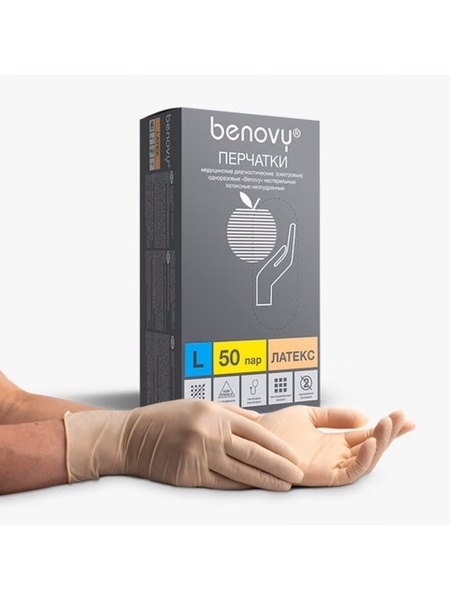 Перчатки латексные опудр. текстур. BENOVY, р-р L, 50 пар в уп.