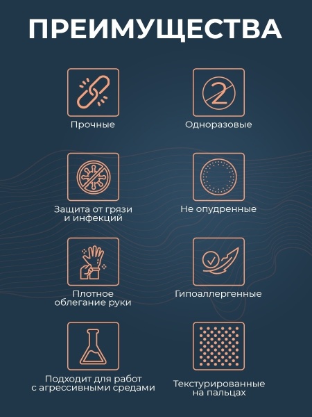 Нитриловые одноразовые перчатки снабжены валиком, скрученным вовнутрь, что препятствует скатыванию перчатки. Нитриловые одноразовые перчатки текстурированные - имеют текстуру на пальцах, что обеспечивает надежный захват предмета.