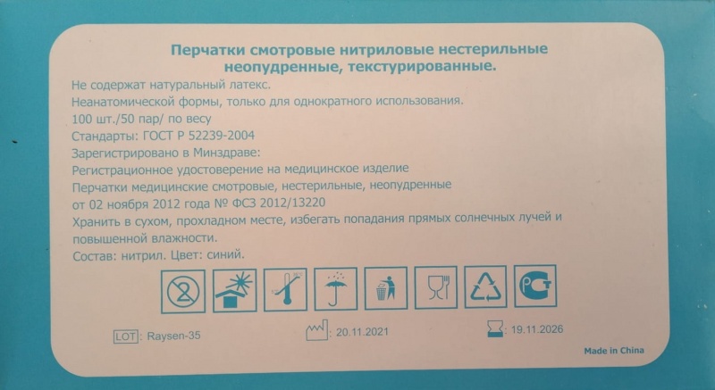 Перчатки нитриловые неопудр. смотровые н/с RAYSEN, голубые, XL, 50 пар в уп.